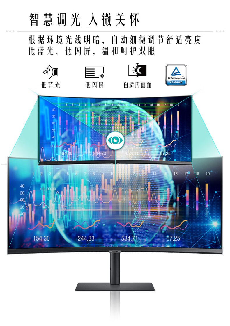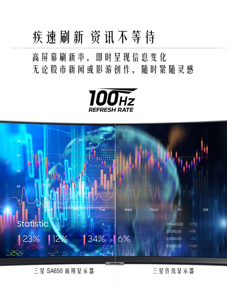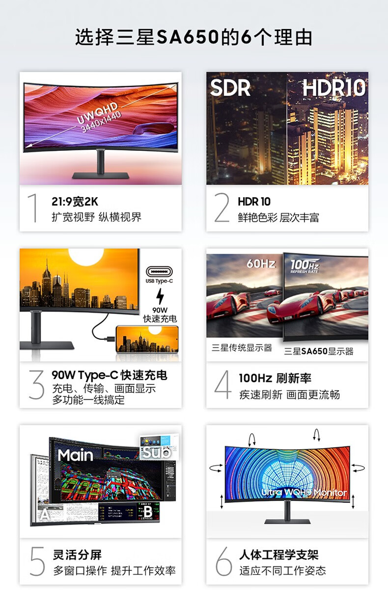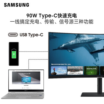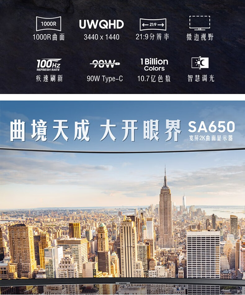 三星(SAMSUNG)S34A650UBC 液晶顯示器 34英寸準(zhǔn)4K/100Hz 電競游戲電腦顯示曲面屏帶魚屏 可壁掛 10億色
