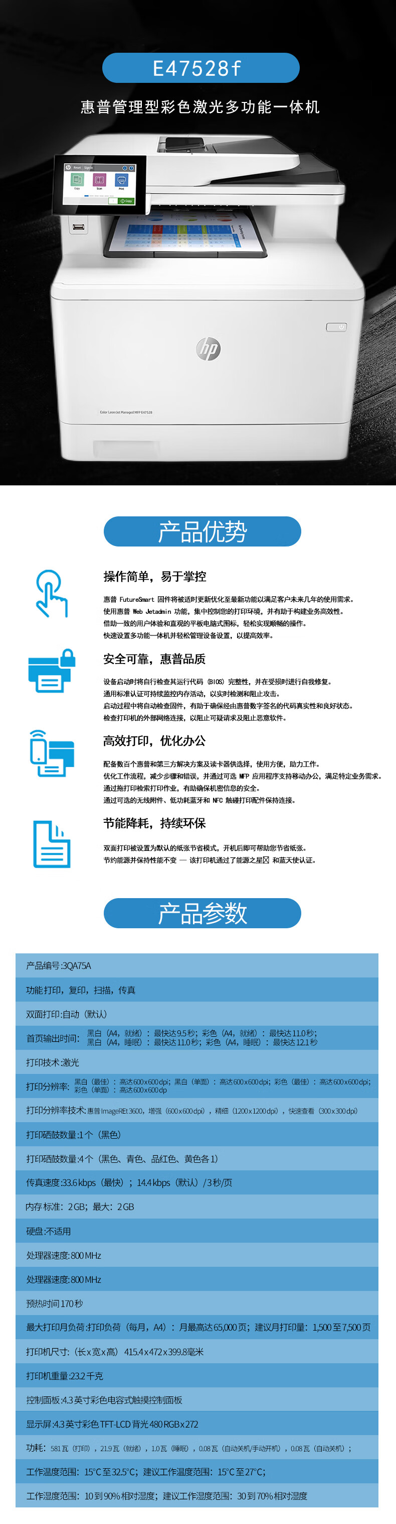 惠普(HP)E47528f A4幅面彩色激光自動雙面打印掃描復(fù)印傳真多功能一體機