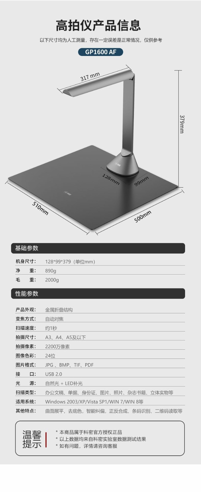 科密GP1600AF高拍儀2200萬高清像素A3\/A4掃描儀辦公招標資料圖片優(yōu)化曲面展平 標配