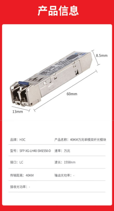 華三/H3C SFP-XG-LH40-SM1550-D 網(wǎng)絡(luò)連接設(shè)備 交換機(jī)光模塊 原裝萬兆40KM單模雙纖模塊LC接口 1550nm光口模塊